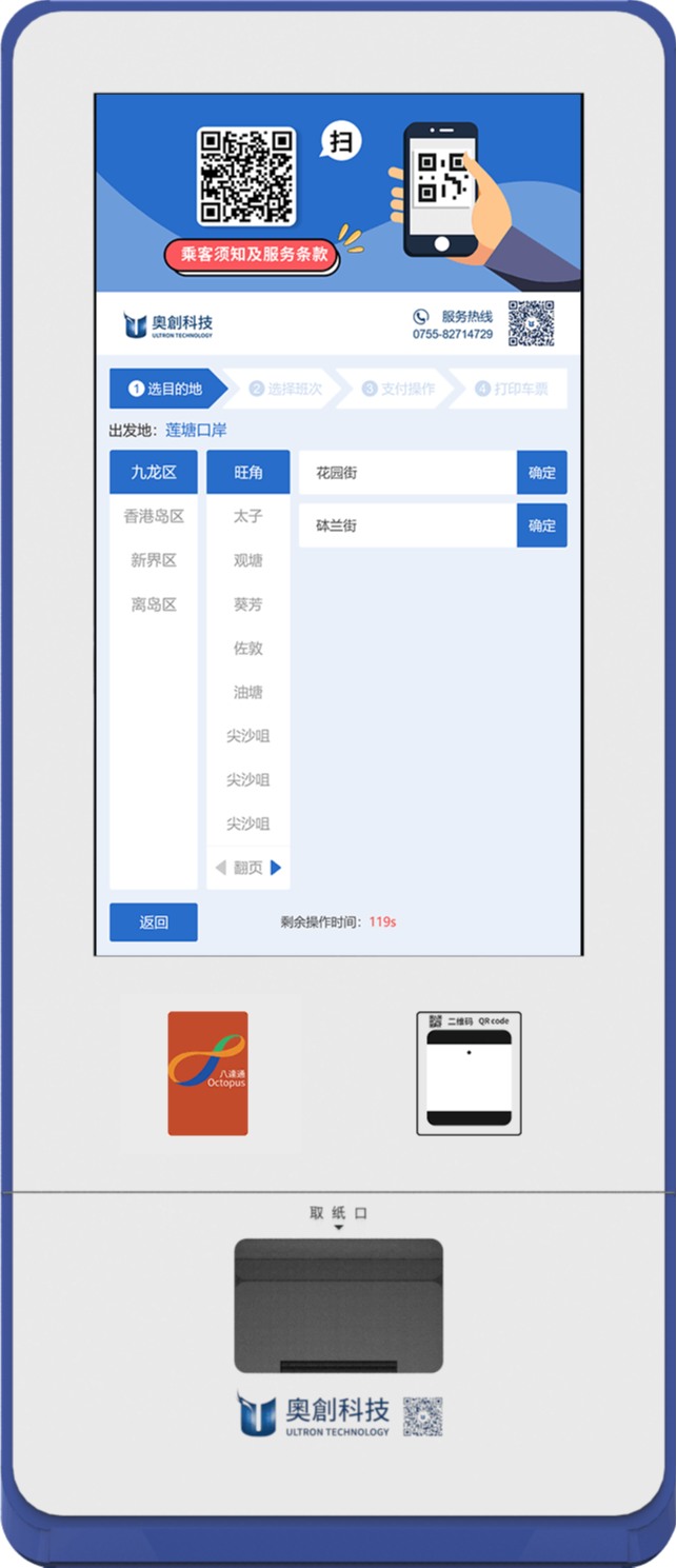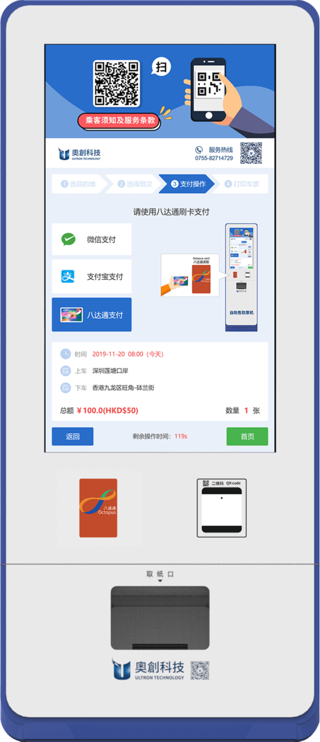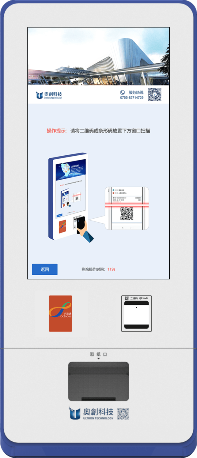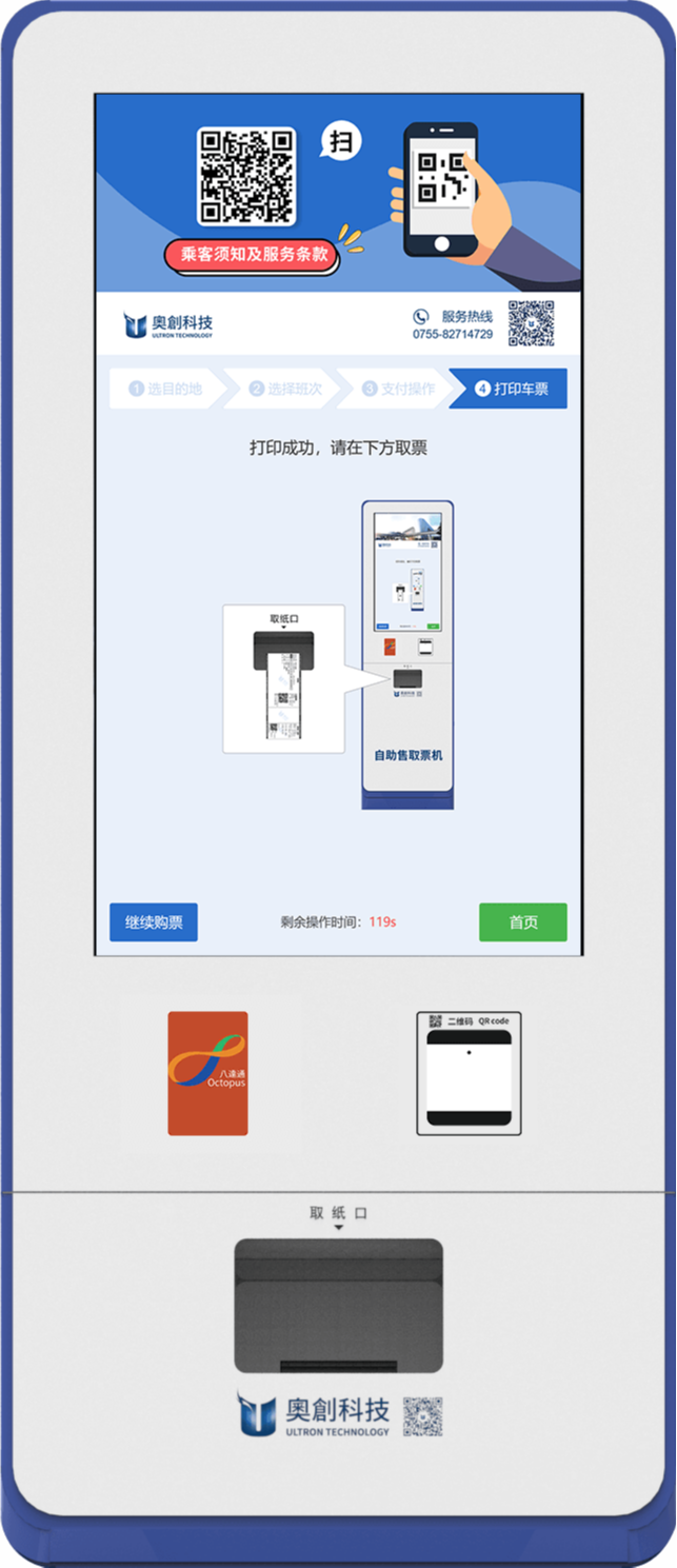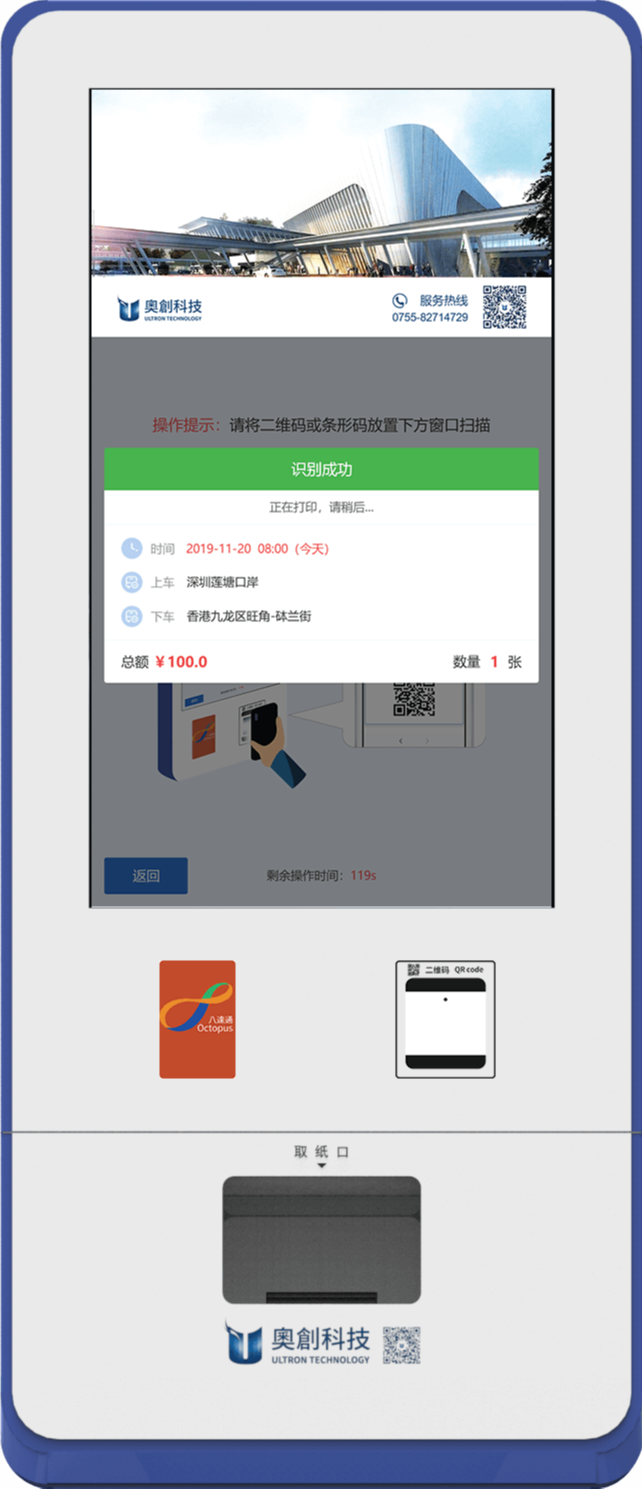 選擇取票操作後,即可通過手機上購買的取票二維碼在機器上掃碼打印車票。